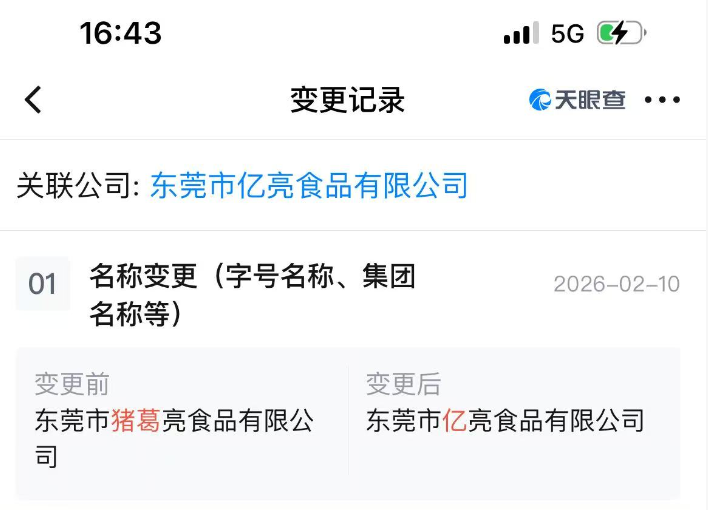 澎湃新闻查询发现,2026年2月10日,东莞市猪葛亮食品有限公司已更名为东莞市亿亮食品有限公司。